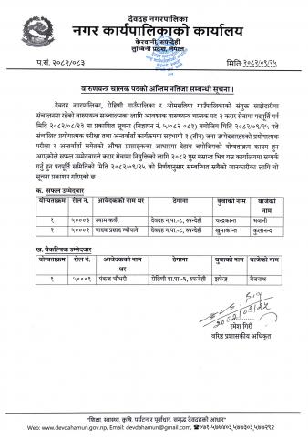 वारुणयन्त्र चालक पदको अन्तिम नतिजा सम्बन्धी सूचना ।