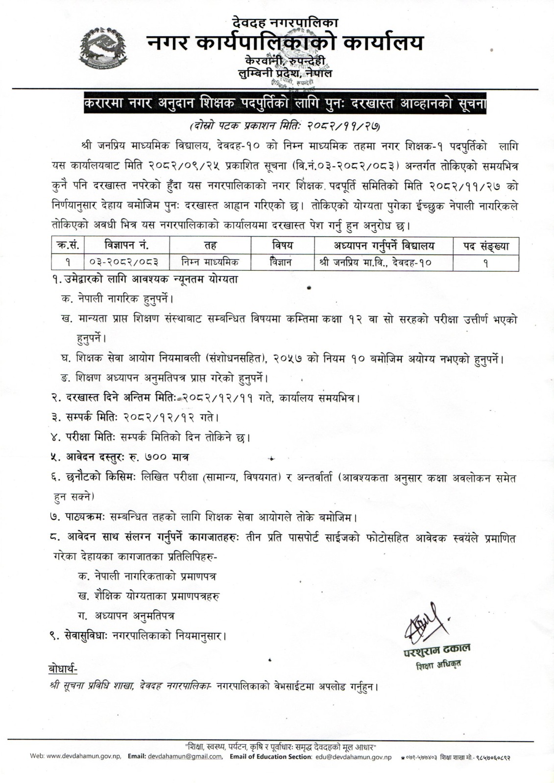 करारमा नगर अनुदान शिक्षक पदपुर्तिको लागी पूनः दरखास्त आह्यनको सूचना ।
