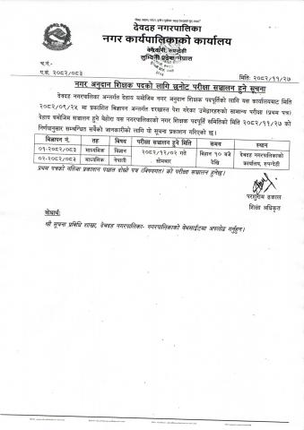 नगर अनुदान शिक्षक पदको लागि छनोट परिक्षा सञ्चालन हुने सूचना ।
