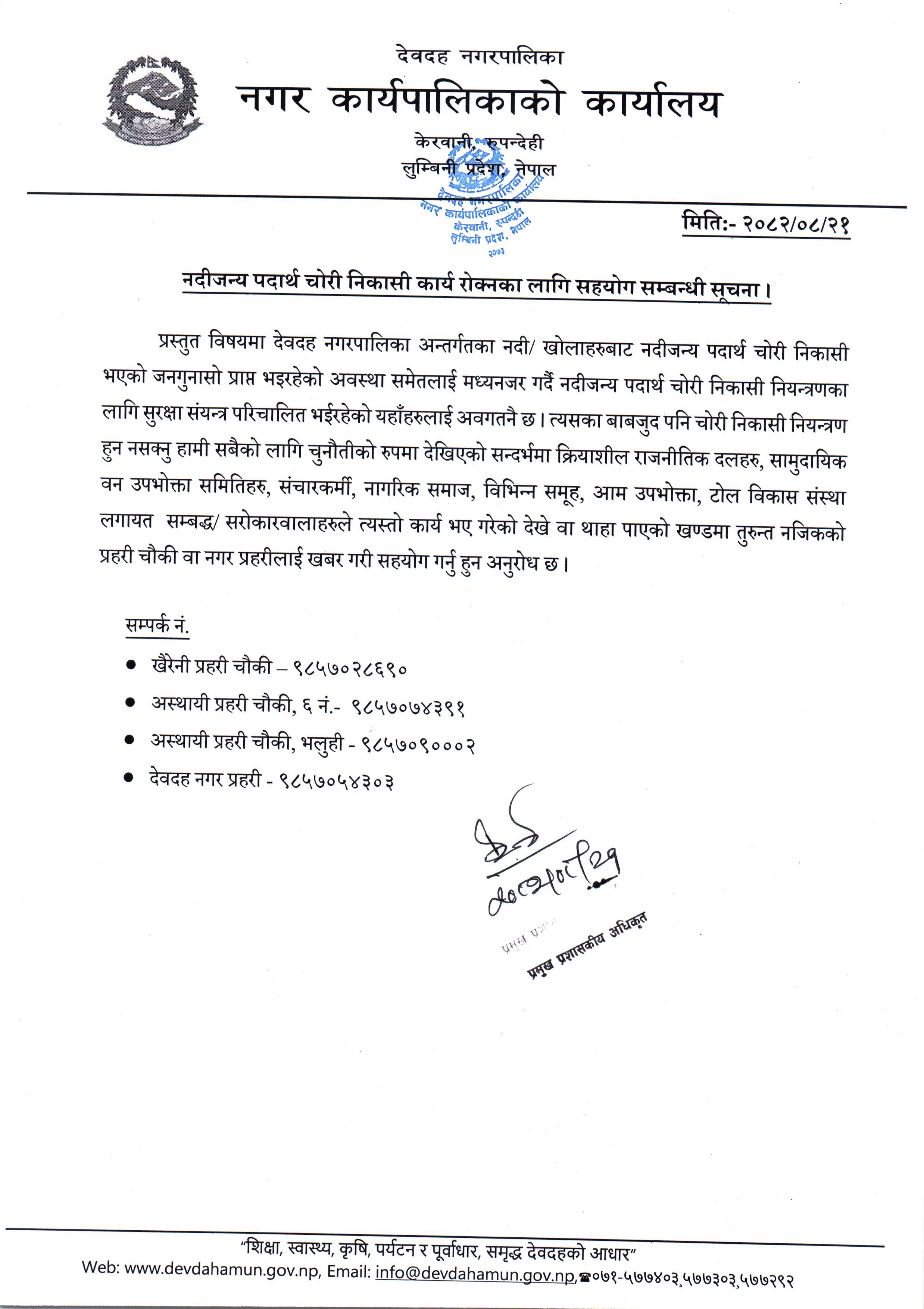नदीजन्य पदार्थ चोरी निकासी कार्य रोक्नका लागि सहयोग सम्बन्धी सूचना ।