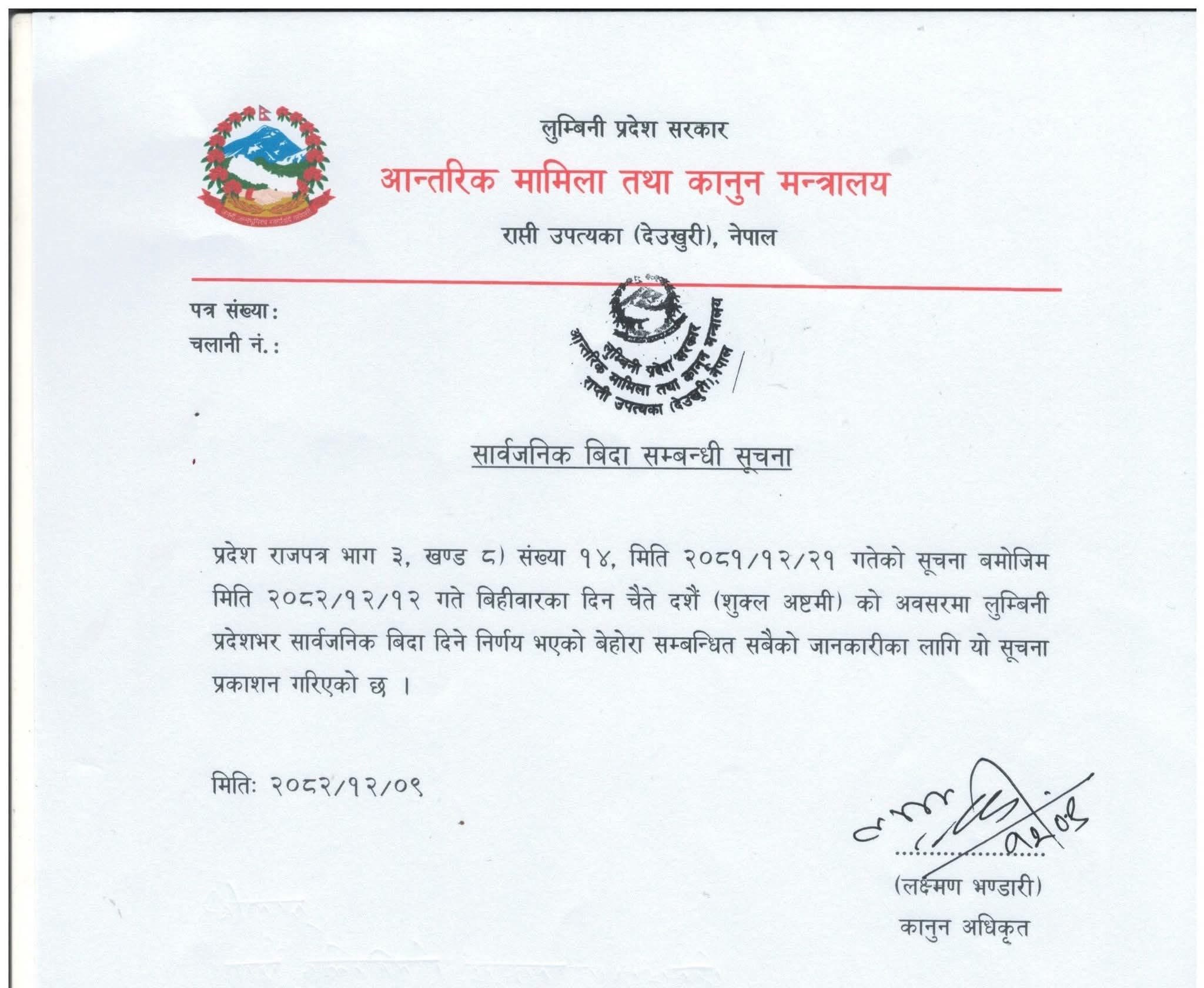 लुम्बिनी प्रदेश सरकारको सार्वजनिक बिदा सम्बन्धी सूचना ।