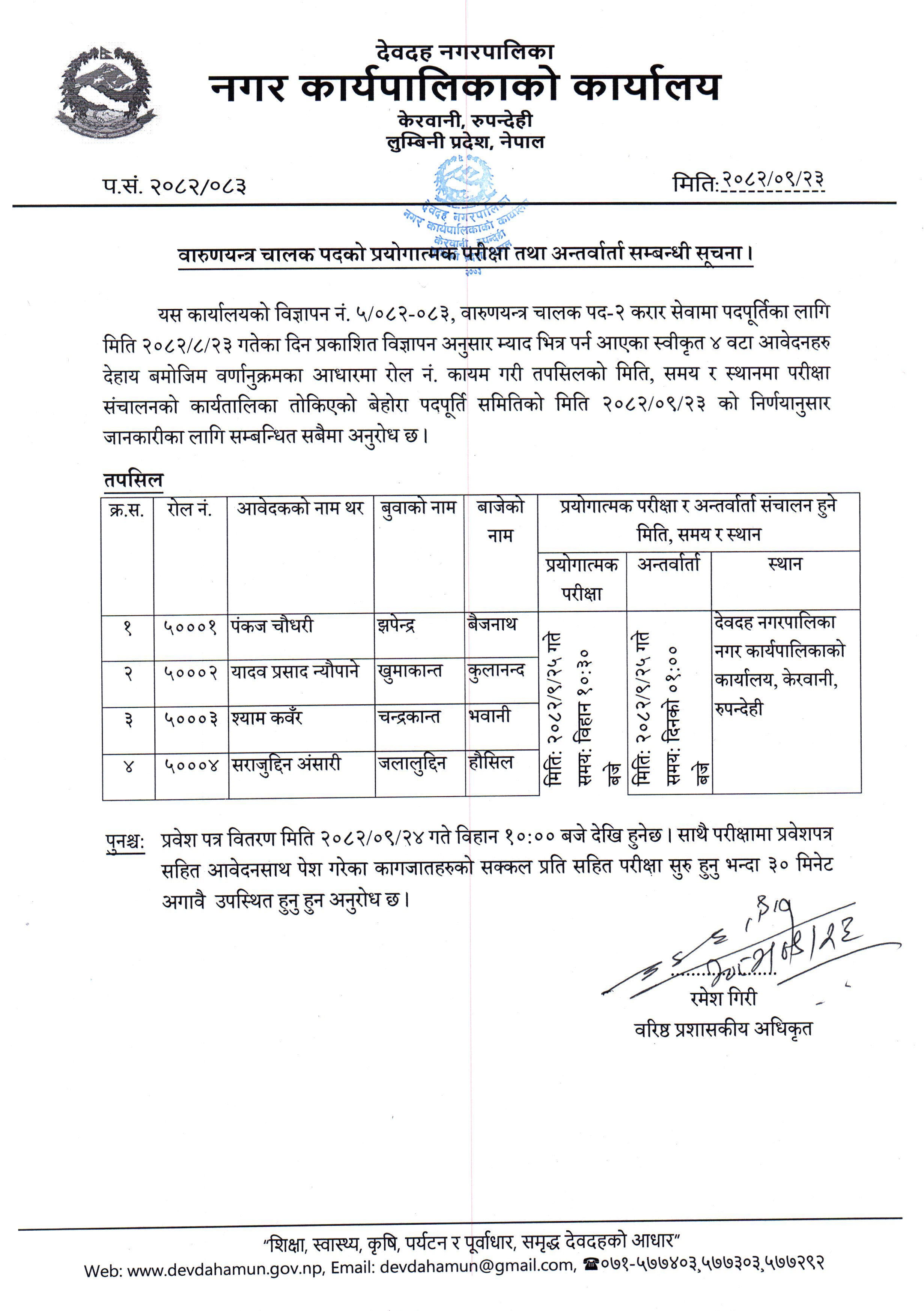 वारुणयन्त्र चालक पदको प्रयोगात्मक परीक्षा तथा अन्तर्वार्ता सम्बन्धी सूचना ।