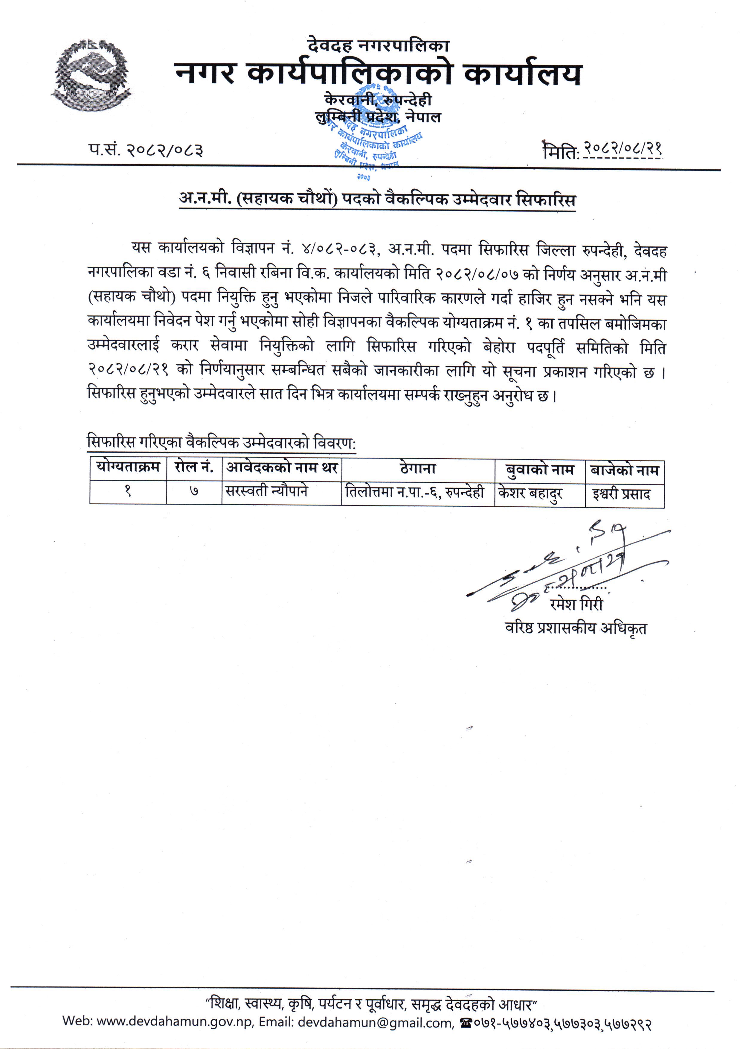 विज्ञापन नं. ४/०८२-०८३ अ.न.मी. (सहायक चौथों) पदको वैकल्पिक उम्मेदवार सिफारिस सम्बन्धमा ।