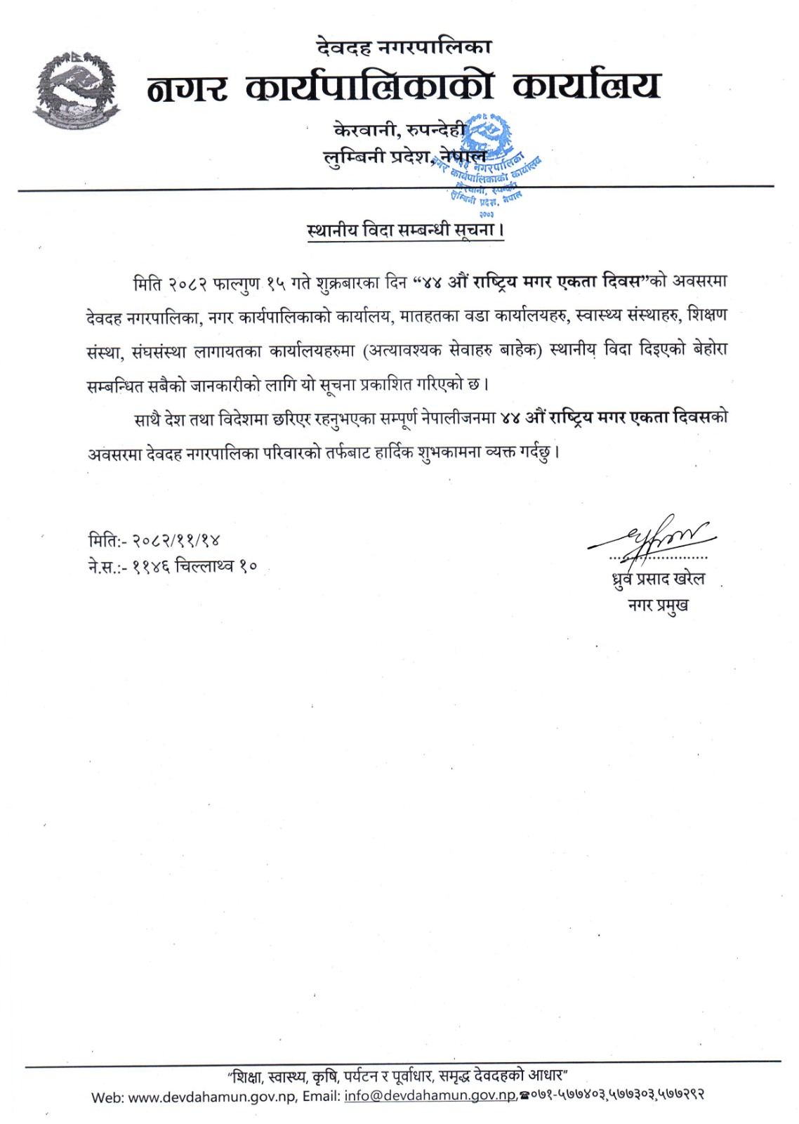 ४४‍ औं राष्ट्रिय मगर एकता दिवसको अवसरमा स्थानीय विदा सम्बन्धी सूचना ।