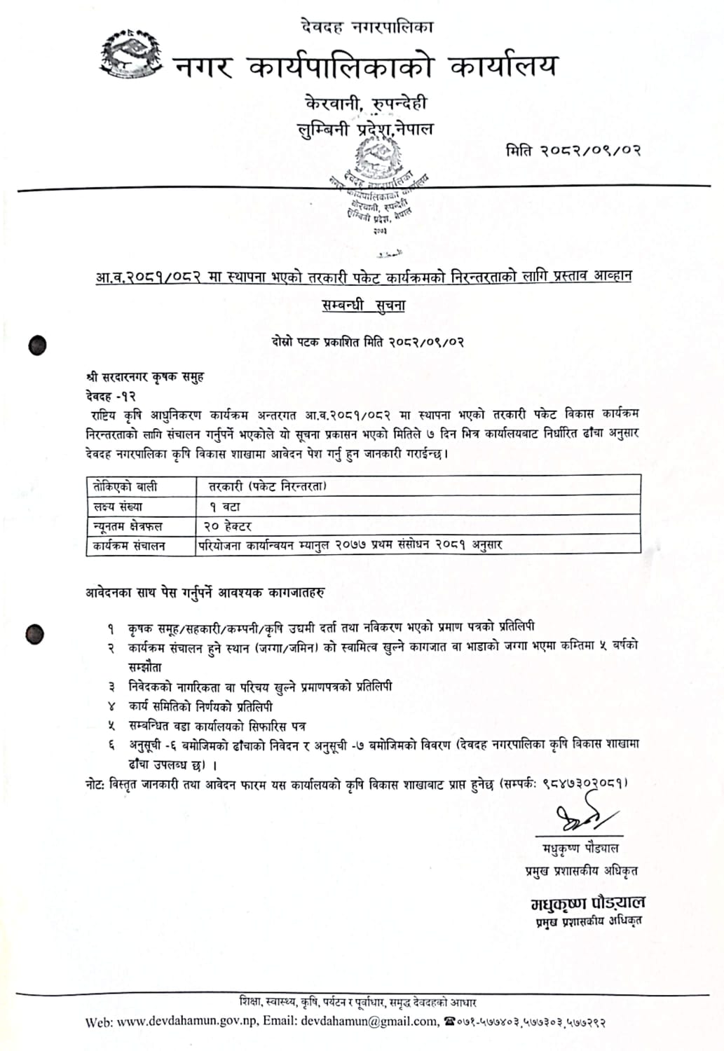 तरकारी पकेट कार्यक्रमको निरन्तरताको लागि प्रस्ताव आव्ह्यन सम्वन्धी सूचना ।