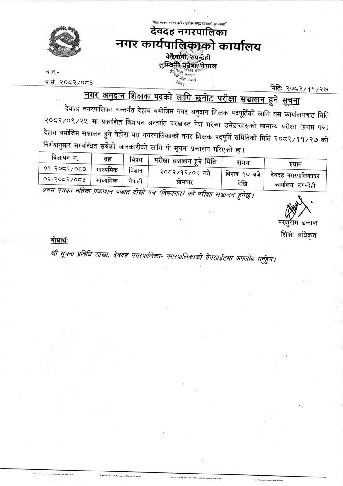 नगर अनुदान शिक्षक पदको लागि छनोट परिक्षा सञ्चालन हुने सूचना ।