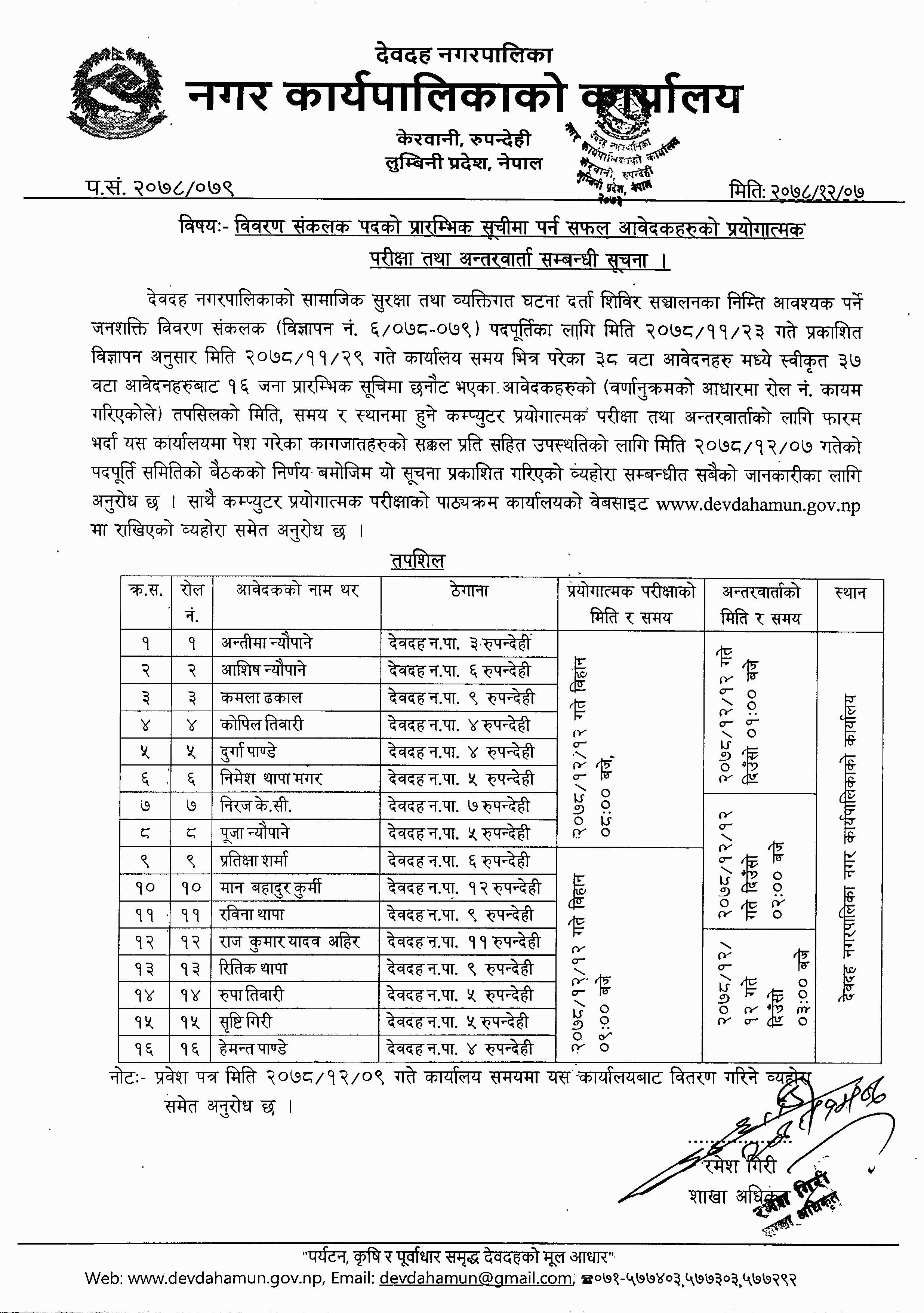विवरण संकलक पदको प्रारम्भिक सूचीमा पर्न सफल आवेदकहरुको प्रयोगात्मक परीक्षा तथा अन्तरवार्ता सम्बन्धी सूचना ।
